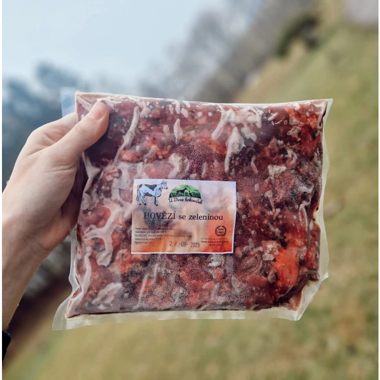 Mletá směs z hovězího ořezu, hovězích drobů a zeleniny.