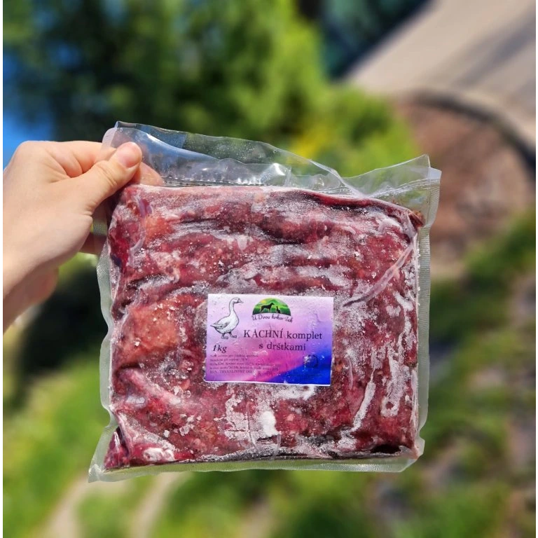 Kachní komplet s dršťkami je kompletní krmivo pro chlupáče, vyrobené z kvalitního kachního masa, kachních kostí, hovězích vnitřností a nepraných drštěk.